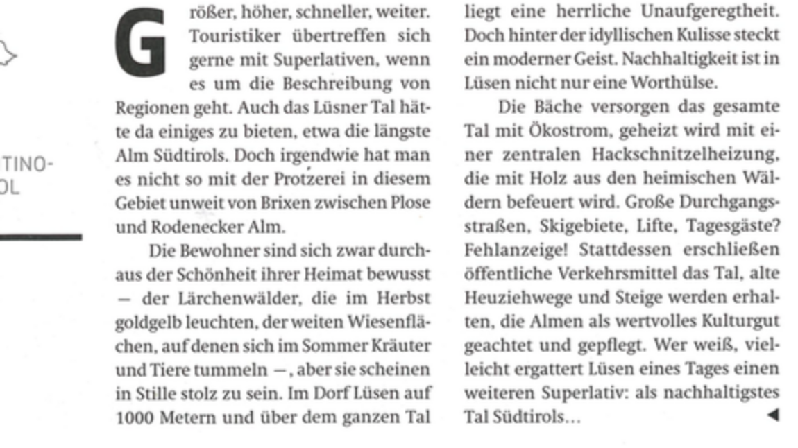 Durch die Abgeschiedenheit, vielen ursprünglichen Wanderwegen und sanften Gipfeln mit herrlicher Rundsicht, ist das Lüsnertal in Südtirol mit seinem Almgebiet bei vielen Menschen, die Idylle und Ruhe suchen, sehr beliebt. Eine nachhaltige Entwicklung und der Aufbau eines Qualitätstourismus sind seit vielen Jahren ein wichtiges Thema im Tal. Dabei geht es in Erster Linie um das Bewahren der Idylle und dem Einsatz ressourcenschonender Maßnahmen zur Erhaltung natürlicher Attraktivität. Die Bäche versorgen das gesamte Tal mit Ökostrom, geheizt wird in Lüsen mit einer zentralen Hackschnitzelheizung und eigenem Holz aus den heimischen Wäldern. Chef Franz als Präsident des Tourismusvereins war es seit Beginn an, ein großes Anliegen im Tal und auf der Alm einen sanften Umgang mit der Natur zu pflegen und eine nachhaltige Wirtschaft anzustreben. Der Gedanke der Gemeinwohlökonomie, eine hochwertige Bio-Landwirtschaft, eine harmonische Architektur und der Erhalt der Naturlandschaft gehören zu den zentralen Themen.