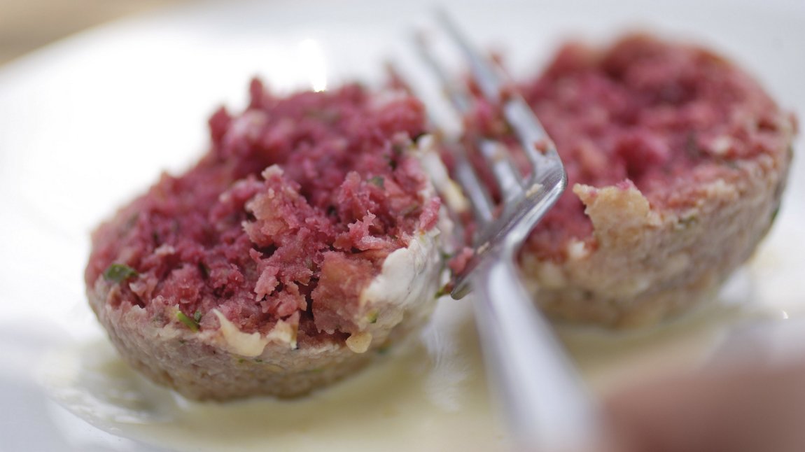 - Die zuvor gekochten roten Rüben mit den Eiern, Salz, Pfeffer, Milch und Muskatnuss mixen.