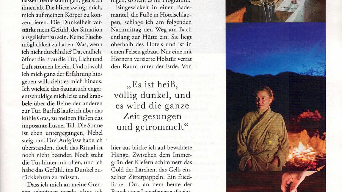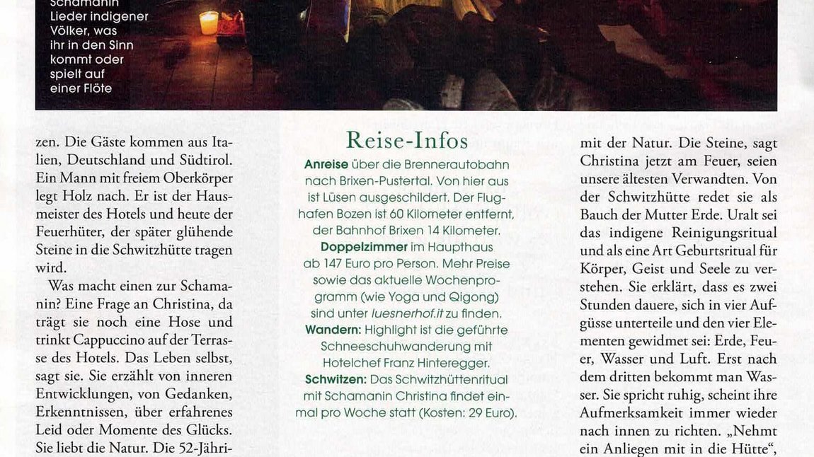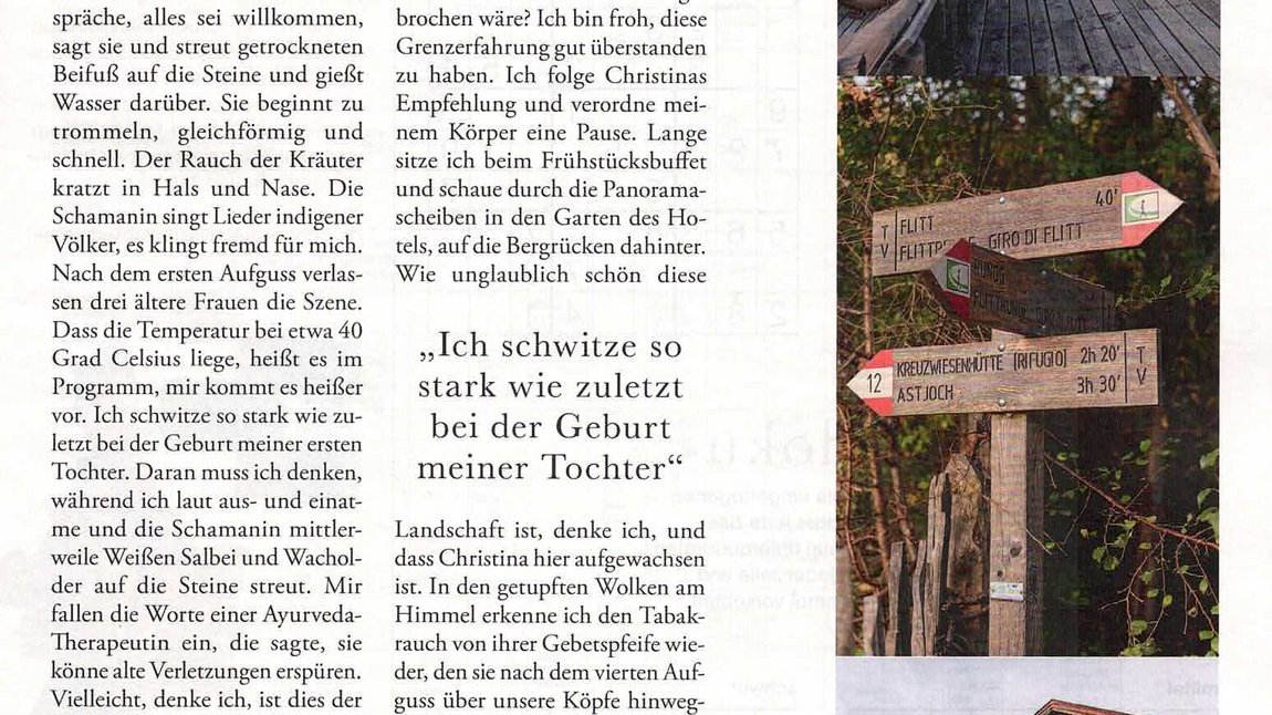 Schamanin Christina sitzt neben der Tür, die heißen Steine werden in der Mitte platziert. Dann schließt sie die Tür, es ist so dunkel, dass ich meine Hand nicht mehr sehe. Alles, was wärend des Rituals aus uns komme, Töne, Themen, Gespräche, alles sei willkommen, sagt sie und streut getrockneten Beifuß auf die Steine und gießt Wasser darüber. Sie beginnt zu trommeln, gleichmäßig und schnell... hier kannst du die komplette Story lesen.