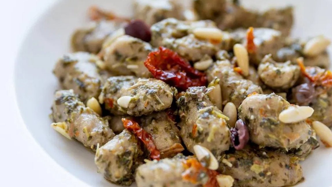 Mix the potatoes with the egg yolk and butter together with a wooden spoon. Add the flour mixture and the roasted buckwheat grains with the wild herb pesto and quickly work into a potato dough. Then form 1.5 cm thick rolls and cut into pieces of the same length. Unroll the dumplings with the help of a fork and boil in salted water for 1-2 minutes until they float to the surface. Heat olive oil in a pan, then toss the gnocchi with the dried tomatoes and capers briefly in it.