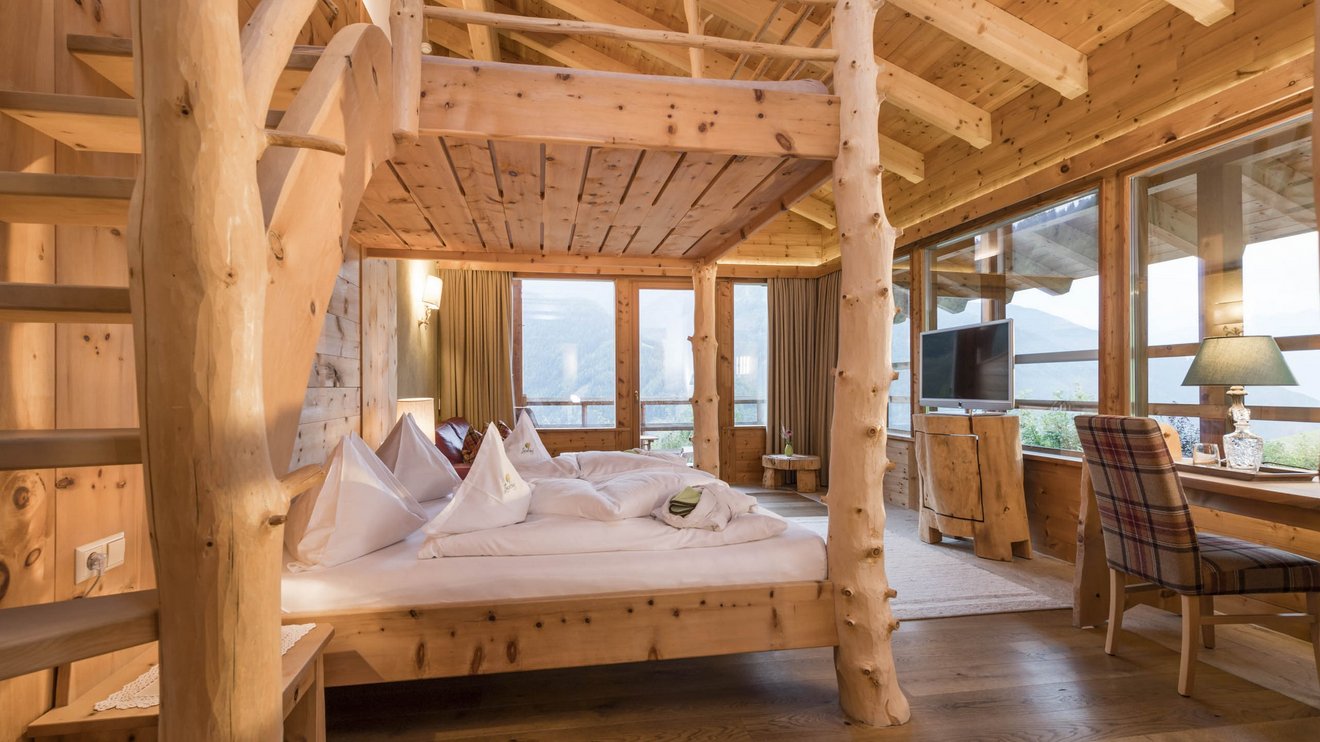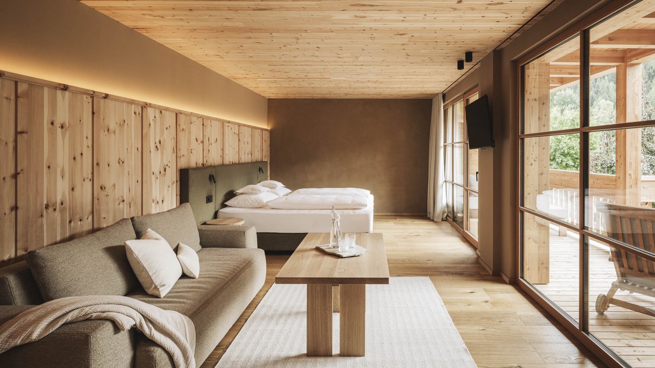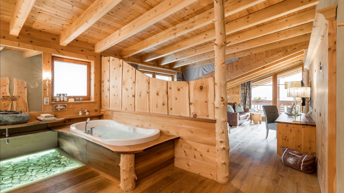 These suites are approximately 45 m² in size and ideal for two to three people. The spacious sleeping and living area creates a pleasant atmosphere. The marble bathroom with jacuzzi or bathtub on the balcony invites for relaxation. From the south-facing balcony and the panoramic windows, you can enjoy a breathtaking view over the valley.