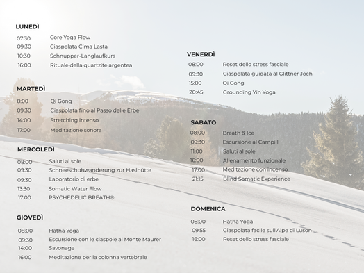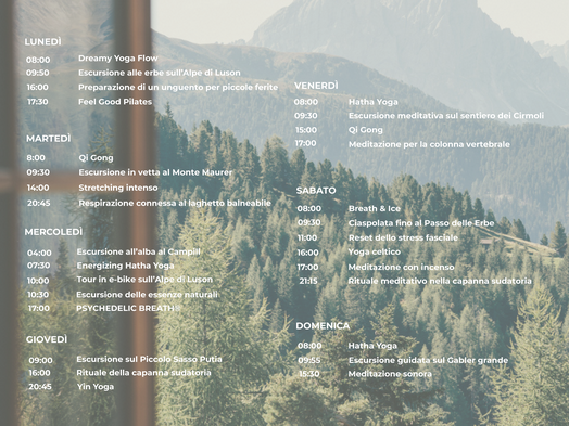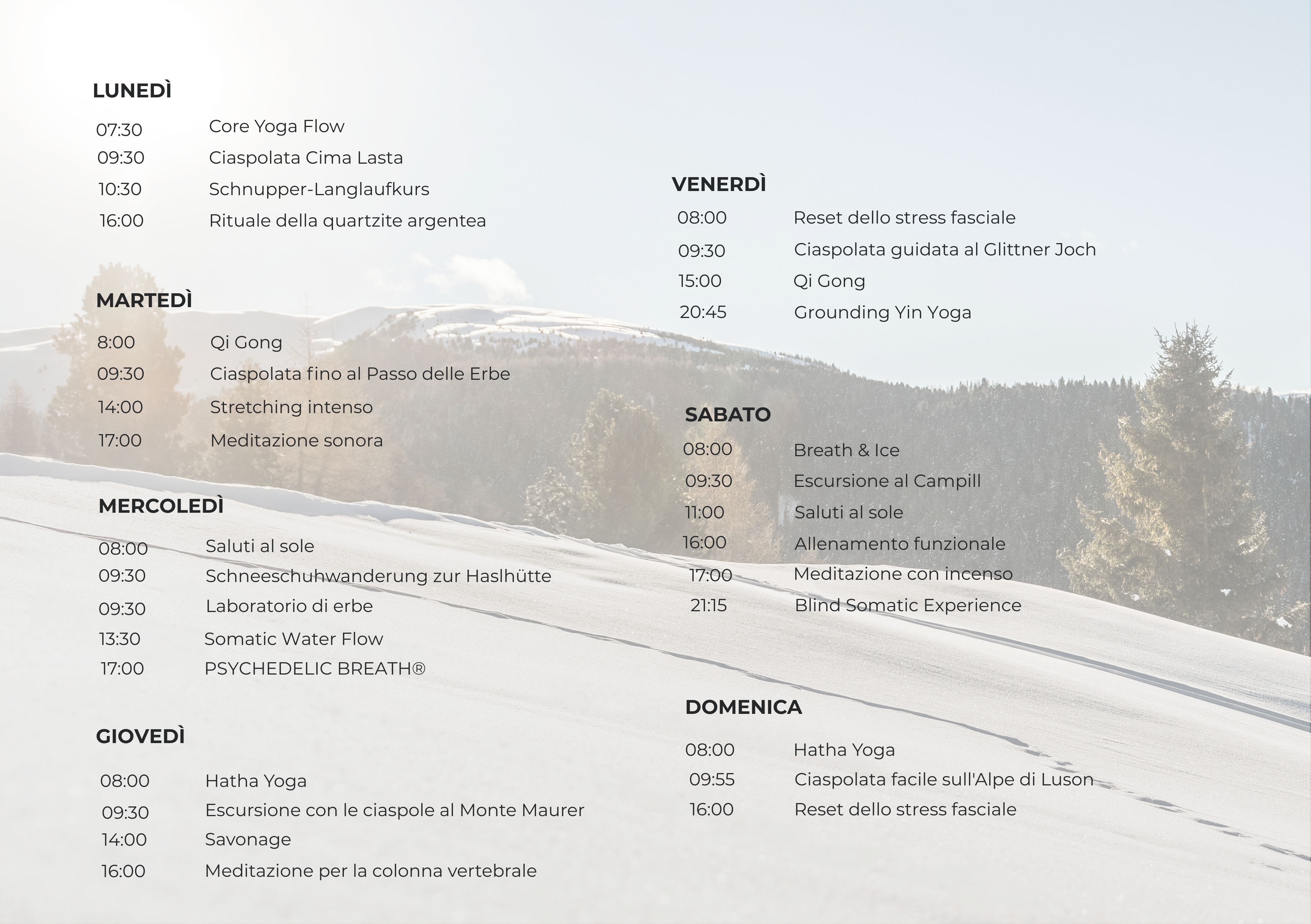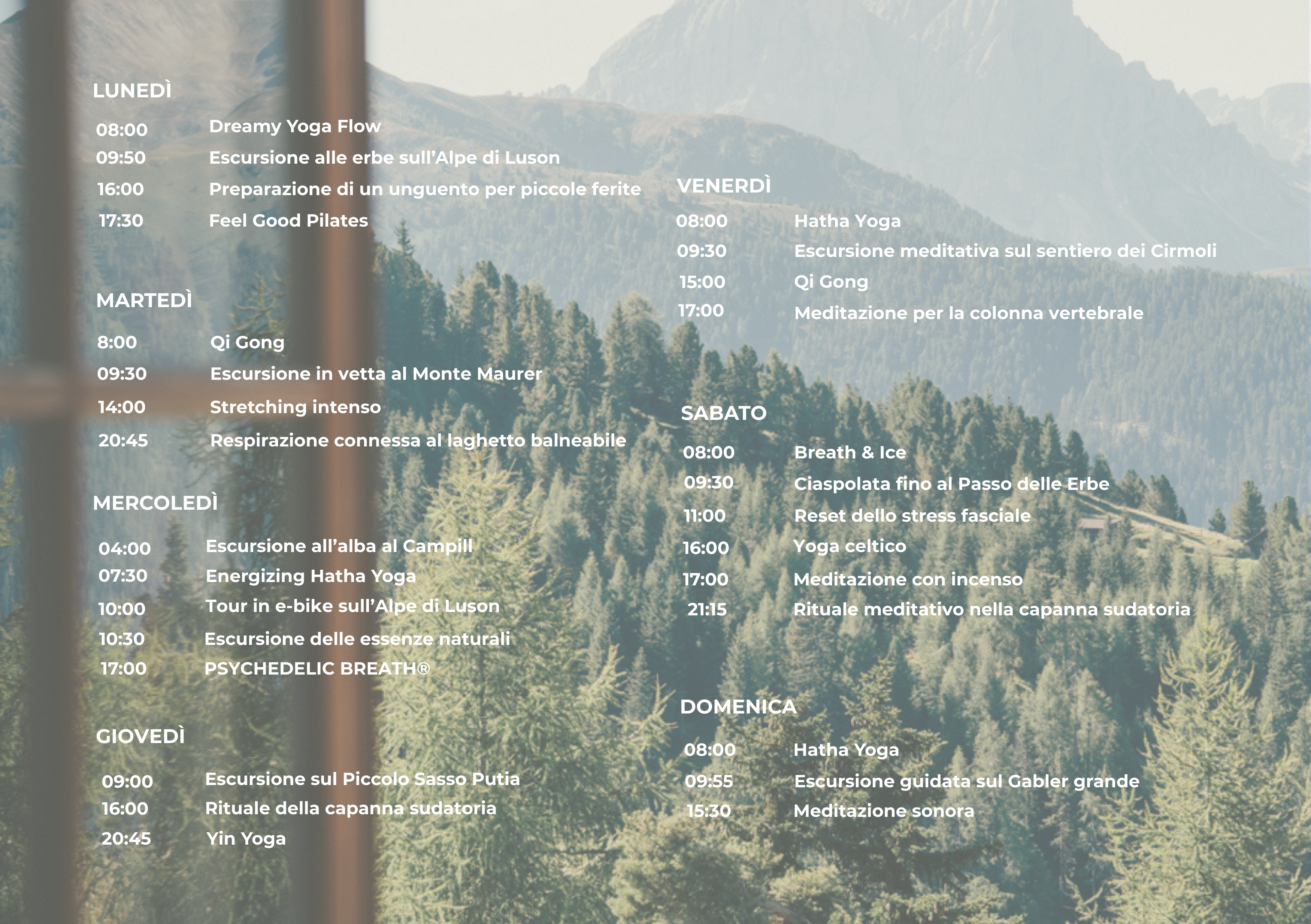 Nel nostro hotel per vacanze attive in Alto Adige offriamo ai nostri ospiti un ricco e variegato programma settimanale con escursioni guidate, sessioni di yoga nella iurta, scrub, gettate di vapore, degustazioni di vino, escursioni con le ciaspole e molto altro ancora.