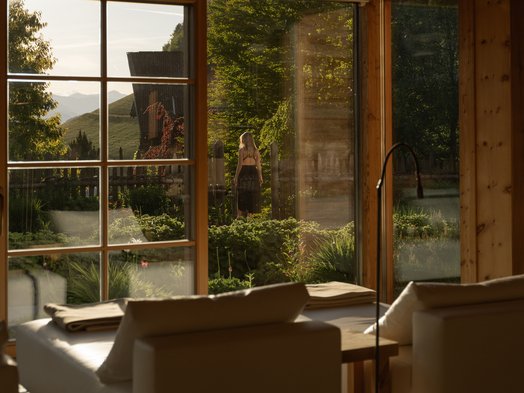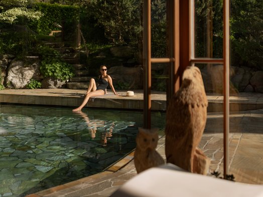 Il viaggio inizia dal padiglione della aqua salina e conduce alla sauna romantica, direttamente accanto al torrente di montagna che invita al kneipp. Verso il limite del bosco, la gondola a infrarossi oscilla con vista sulle fitte foreste e sulle imponenti cime delle montagne. Sopra il luogo di potere, dove nei mesi estivi si praticano Yoga e Qi Gong, il percorso stimolante a piedi nudi conduce alla grotta sudatoria sciamanica. Infine, lungo il percorso di 700 metri del bagno nella foresta, fiancheggiato da un verde denso e da un impressionante panorama montano, si arriva al punto panoramico delle Dolomiti. Su lettini di legno ci si abbandona consapevolmente al silenzio e si ascolta la natura. Fino a tarda sera, le ore di sole avvolgono il sentiero nella natura isolata in una luce calda e meditativa. Un'esperienza per tutti i sensi.