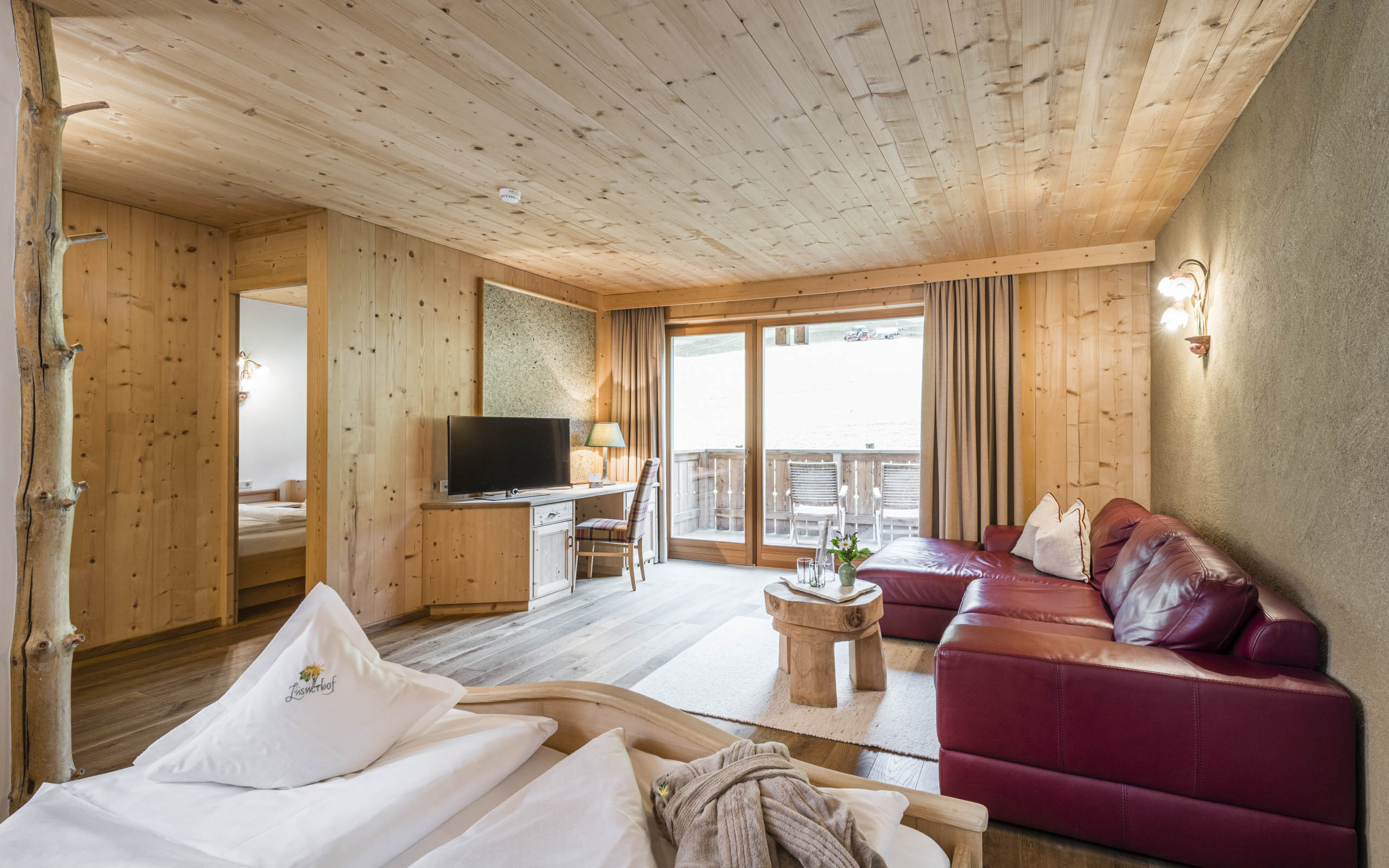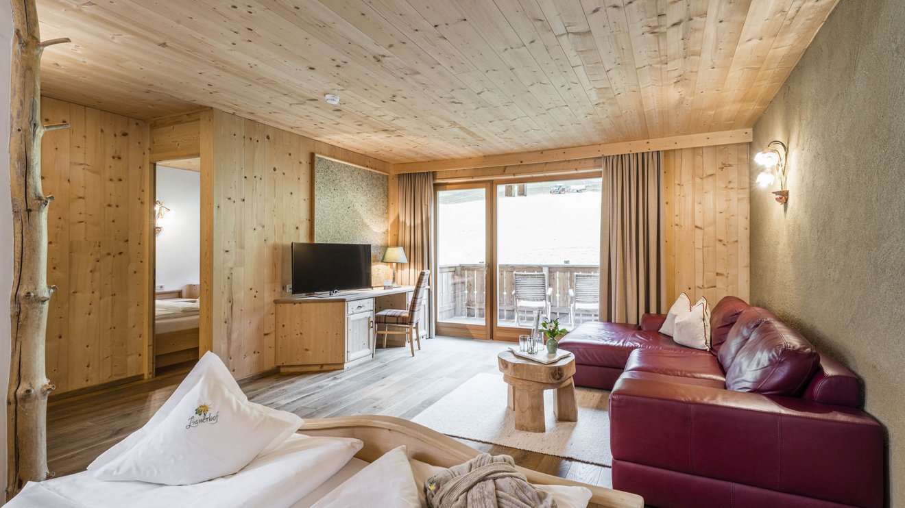 Le nostre camere familiari Lavanda, con una superficie di 28-30 m², dispongono di una seconda camera da letto separata per 1-2 persone e sono arredate con legno dei nostri boschi e materiali naturali, creando un’atmosfera accogliente. Dal balcone si può ammirare i prati e boschi della vicina Alpe di Luson.