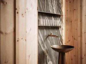 Nachhaltig gebaut, tief verwurzelt in der Region: Dolomitgestein, Zirben- und Lärchenholz aus den umliegenden Wäldern, Lehmputzwände, Laaser Marmor, Dolomitgestein und hochwertige Naturmaterialien schaffen ein harmonisches Raumklima für ein natürliches Wohlbefinden.