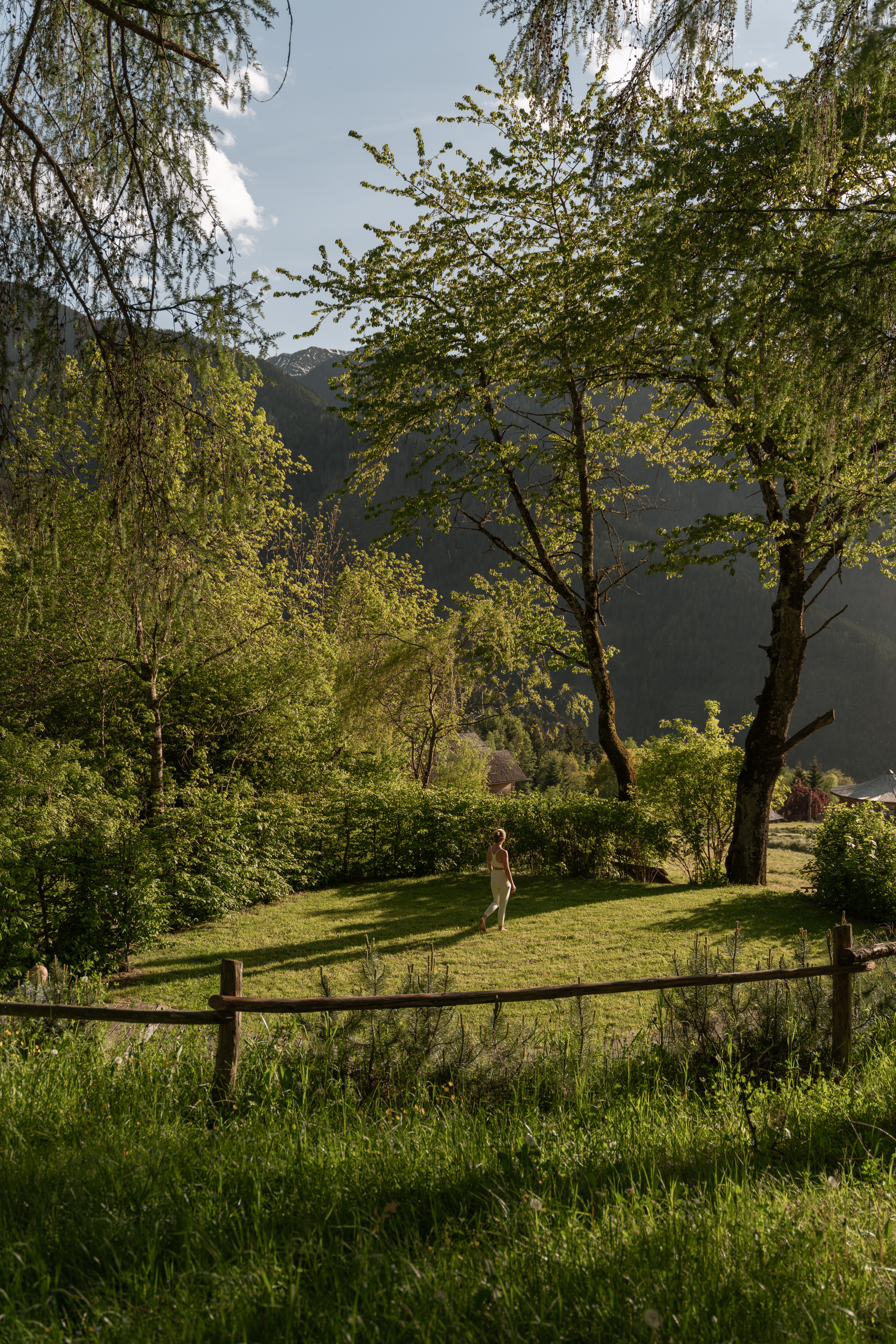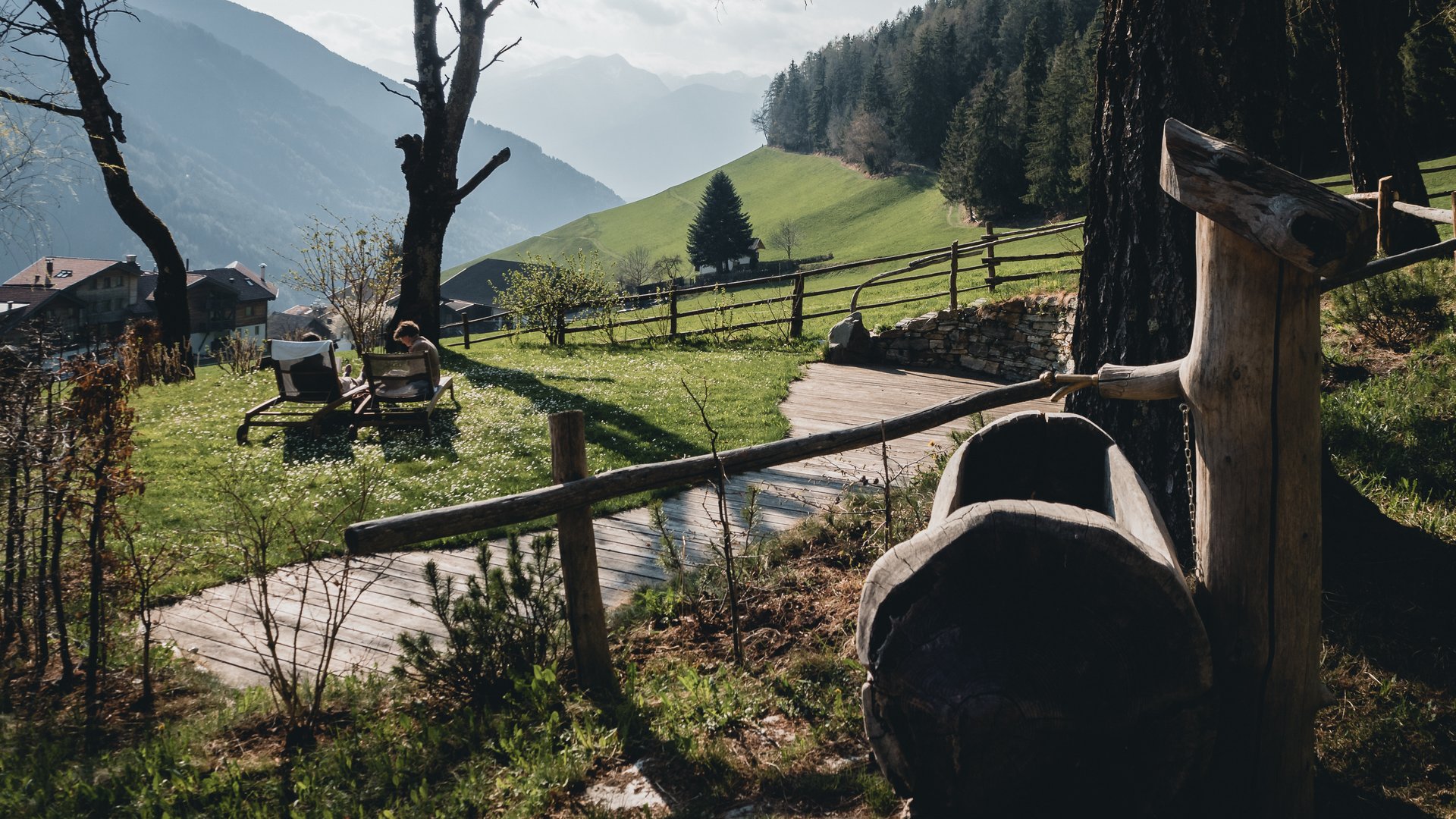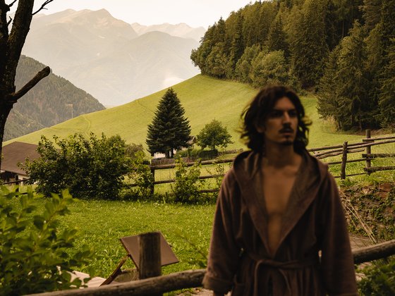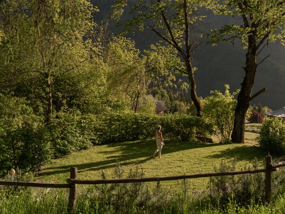 Die Reise beginnt beim Solepavillon und führt zur wildromantischen Bachsauna, direkt am rauschenden Gebrigsbach, der zum Kneippen einlädt. In Richtung Waldrand schaukelt die Infrarotgondel mit Blick auf die dichten Wälder und imposanten Berggipfel. Über dem Kraftplatz, wo in den Sommermonaten Yoga und Qi Gong praktiziert werden, führt der stimulierende Barfußweg zur schamanischen Schwitzhöhle. Abschließend gelangt man entlang des 700m langen Waldbaden-Pfades, gesäumt von dichtem Grün und beeindruckendem Bergpanorama, zum Dolomiten Aussichtspunkt. Auf Holzliegen gibt man sich achtsam der Stille hin und lauscht der Natur. Bis spät in in den Abend hüllen die Sonnenstunden die Promenade in abgeschiedener Natur in ein warmes und meditatives Licht. Eine Erfahrung für alle Sinne.