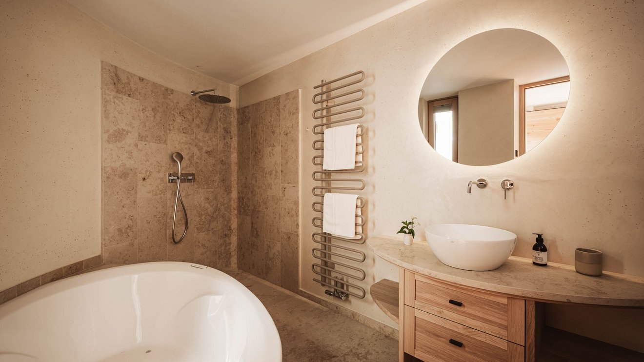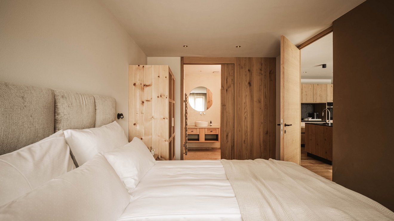 Ausstattung: Größe 65m² mit zusätzlichen 30m² Privatgarten sowie Loggia, 2 Schlafzimmer mit hochwertigen Betten für einen gesunden Tiefschlaf, vollausgestatte Küche mit Spülmaschine und Backrohr, großzügigem Wohnraum und direktem Zutritt zum Privatgarten, Sonnenliegen und Sitzmöglichkeiten im privaten Garten, 2 luxuriöse Marmorbäder (1 En-suite-Bad), Föhn, TV mit Smart Home Zugriff, WIFI, Safe, Naturellness Kosmetik Kit, Wellnesstasche mit Bademantel, Saunatücher und nachhaltige Frottee-Slippers, frisches Plose-Quellwasser direkt aus dem Wasserhahn