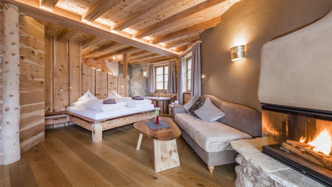 Diese Suite liegt im Badehaus Terra, einem der beiden Alpin Badehäuser im Wellnessgarten und wurde vollständig mit Zirbenholz gestaltet. Mit einem offenen Kamin, einem gemütlichen Wohnbereich und einem Balkon mit Blick auf die umliegende Natur des Lüsner Tal bietet sie einen einzigartigen Rückzugsort. Der private Wellnessbereich des Badehauses Quarzit mit Soleschwebegrotte steht täglich von 10 bis 22 Uhr zur Verfügung und ist bei Buchung dieser Suite inbegriffen.